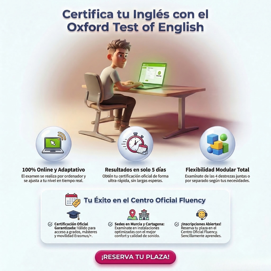 🎓 El Oxford Test of English, completamente informatizado, es una forma moderna de acreditar oficialmente los niveles A2, B1, B2 o C1 en inglés. Este título es válido para acceder a programas de máster, solicitar becas Erasmus/Erasmus+ y también para la habilitación lingüística.